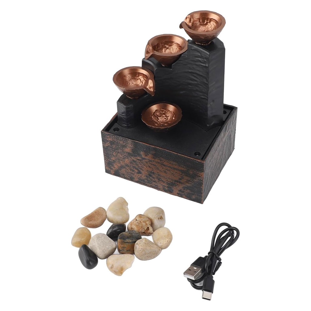 3️⃣ إضاءة LED دافئةالإضاءة المدمجة LED تُبرز جمال حركة المياه وتضيف توهجًا لطيفًا يجعل النافورة قطعة ديكور رائعة سواءً على المكتب أو الرف أو طاولة القهوة.