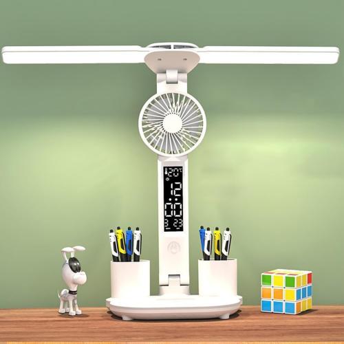 Lampe de bureau LED à double tête avec ventilateur et Horloge – مصباح مكتب مع منبه ومروحة مدمجة