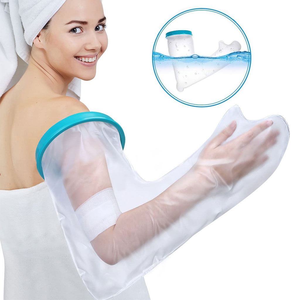 بطول 60 سم، يغطي الذراع بالكامل، مما يجعله مثاليًا لحماية الأصابع والذراع. مصنوع من مادة خفيفة، صحية وقابلة للغسل، لا تلتصق بالذراع. الفتحة المركزية المرنة، التي يمكن أن تمتد حتى 15 سم قطرًا، واسعة بما يكفي لمرور الجبيرة، وفي الوقت نفسه محكمة بما يكفي لمنع تسرب الماء.